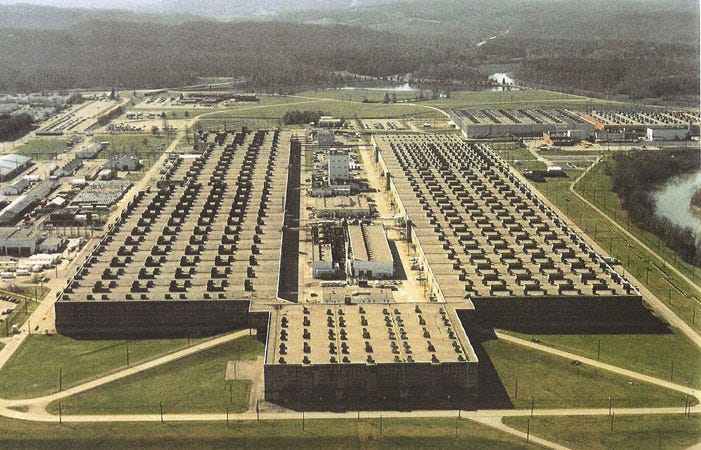 …The calutron structures of steel and brick and tile, chemistry laboratories, a distilled water plant, sewage treatment plants, pump houses, a shop, a service station, warehouses, cafeterias, gatehouses, change houses and locker rooms, a paymaster’s office, a foundry, a generator building, eight electric substations, nineteen water-cooling towers - for an output measured in the best of times in grams per day. - The Making of the Atomic Bomb
