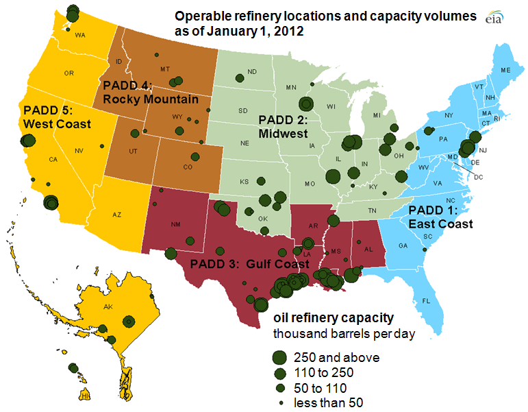 Chevron Richmond is just one of 132 operable oil refineries in the U.S., which collectively can refine over 18 million barrels of crude oil each day. The location of these refineries is highly concentrated: most of them are on the Gulf Coast of Texas and Louisiana, with other clusters in New Jersey, the Midwest, and in California.