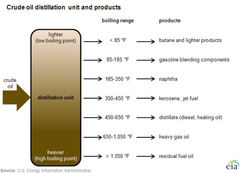 Substances derived from crude oil are often mixtures of chemicals defined by their range of boiling points. Gasoline, for instance, isn’t just one chemical: it’s a mixture of hydrocarbons, mostly molecules with between four and 12 carbon atoms. The EIA defines finished gasoline as “having a boiling range of 122 to 158 degrees Fahrenheit at the 10 percent recovery point to 365 to 374 degrees Fahrenheit at the 90 percent recovery point.”2