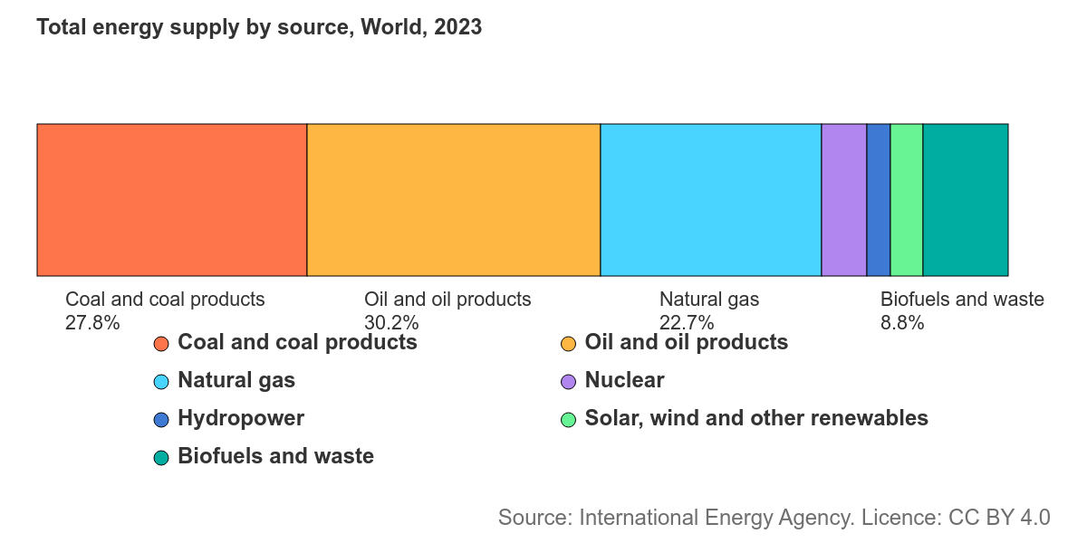 Though wind and solar continue to carve out larger and larger shares of world energy supply, the modern world still runs on petroleum, and will continue to do so for the foreseeable future. The world consumes over 100 million barrels of oil a day. As of 2023, oil was responsible for 30% of all energy use worldwide, higher than any other energy source (though its share has been gradually falling). In chemical manufacturing, petroleum is even more critical: an astounding 90% of chemical feedstocks are derived from oil or gas. Virtually all plastic comes from chemicals extracted from oil or gas, and petrochemicals are used to produce everything from lubricants to paint to plywood to synthetic fabrics to fertilizer.