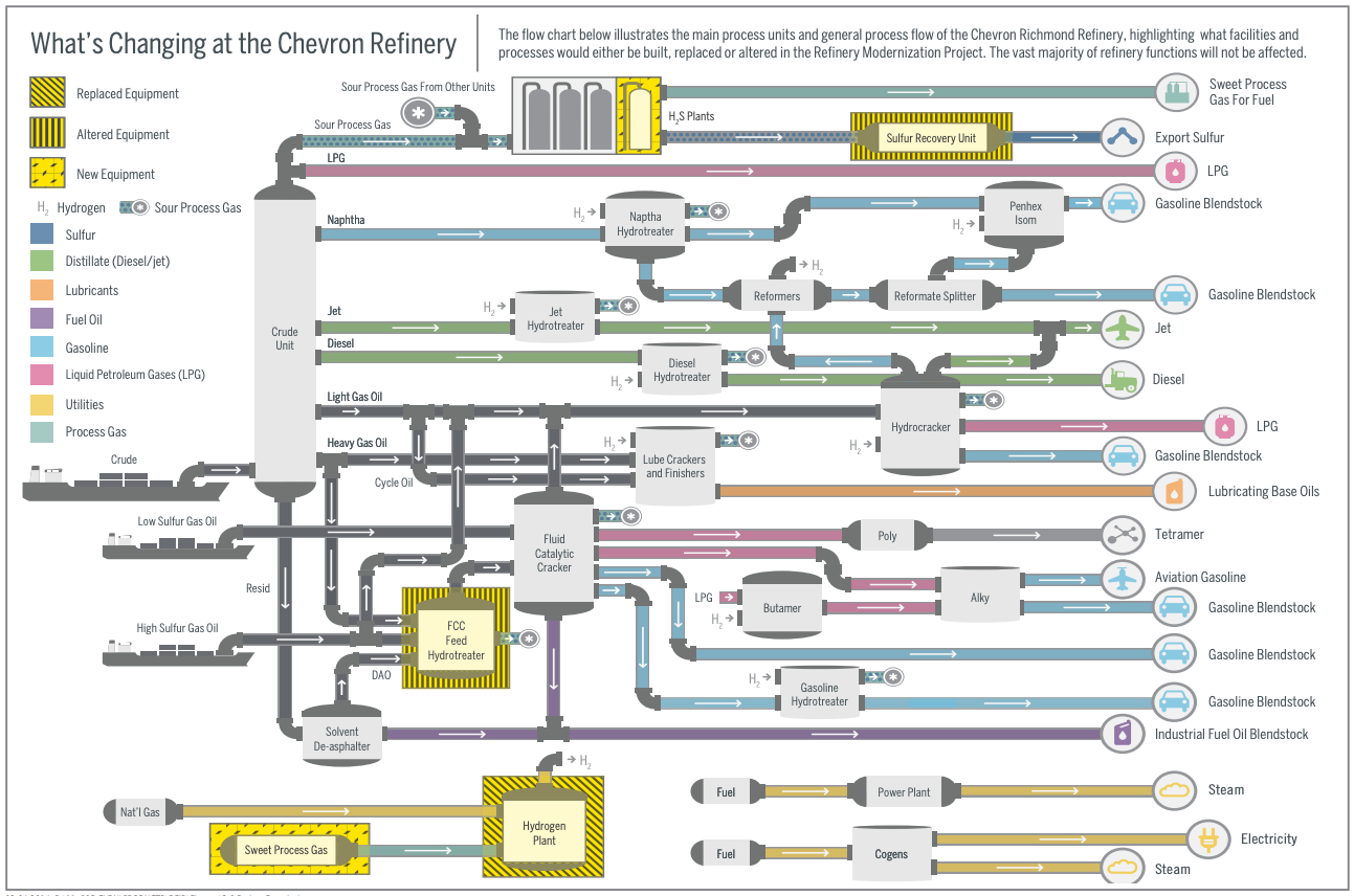 To see how these processes are actually arranged, we can look at a process flow diagram for the refinery. (This diagram is available because several years ago Chevron extensively modified this refinery, which required them to submit a very detailed environmental impact report to comply with California’s environmental quality laws.)