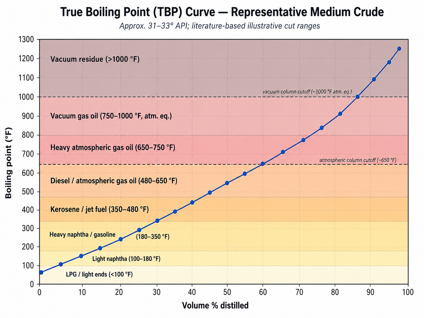 A refinery makes use of several different methods to separate and process crude oil, but the most important process of all is probably distilling. Different molecules within crude oil boil at different temperatures, and condense back into liquid at different temperatures. Smaller, lighter molecules boil and condense at lower temperatures, while larger and heavier molecules boil and condense at higher temperatures. You can describe this range of boiling points with a distillation curve, which shows what fraction of the crude oil boils at different temperatures. In the example curve below, we can see that at about 350°C half the crude has boiled off, and at 525°C about 80% of the crude has boiled off. Different crude oils will have slightly different distillation curves, depending on the proportion of different molecules within them.