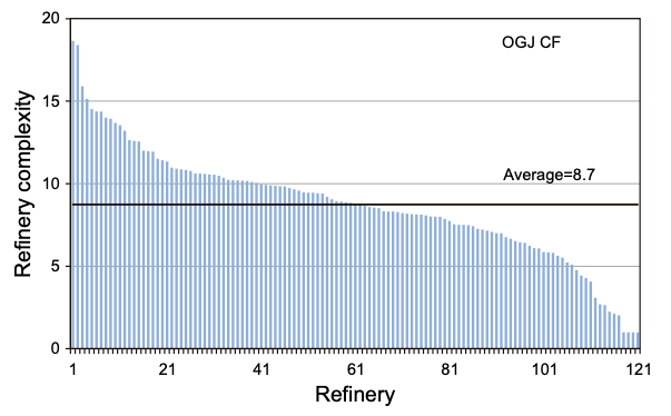 Most refineries in the US are fairly complex. As of 2014, less than 3% of refineries had a complexity index of 2 or less, and the average complexity index was 8.7. As of 2014 the Chevron Richmond refinery had a complexity index of 14, above average for US refineries. The Jamnagar refinery, in addition to being the world’s largest, is also particularly complex: its complexity index of 21 would make it more complex than virtually any US refinery.