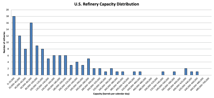 We can look at the relative complexity of different US refineries using the Nelson Complexity Index, which is intended to measure how complex a refinery is. The index is constructed by taking each process a refinery employs, and multiplying its refining capacity by a “complexity factor” that compares the cost of that process to atmospheric distillation, and then dividing by the refinery’s atmospheric distillation capacity. So a refinery that has 100,000 barrels of atmospheric distillation capacity (complexity factor of 1) and 50,000 barrels of vacuum distillation capacity (complexity factor of 2) would have a Complexity Index of 1 + 2 * 50,000 / 100,000 = 2. If it then added 25,000 barrels of catalytic cracking capacity (complexity factor of 6), its Complexity Index would rise to 1 + 1 + 6 * 25,000 / 100,000 = 3.5.