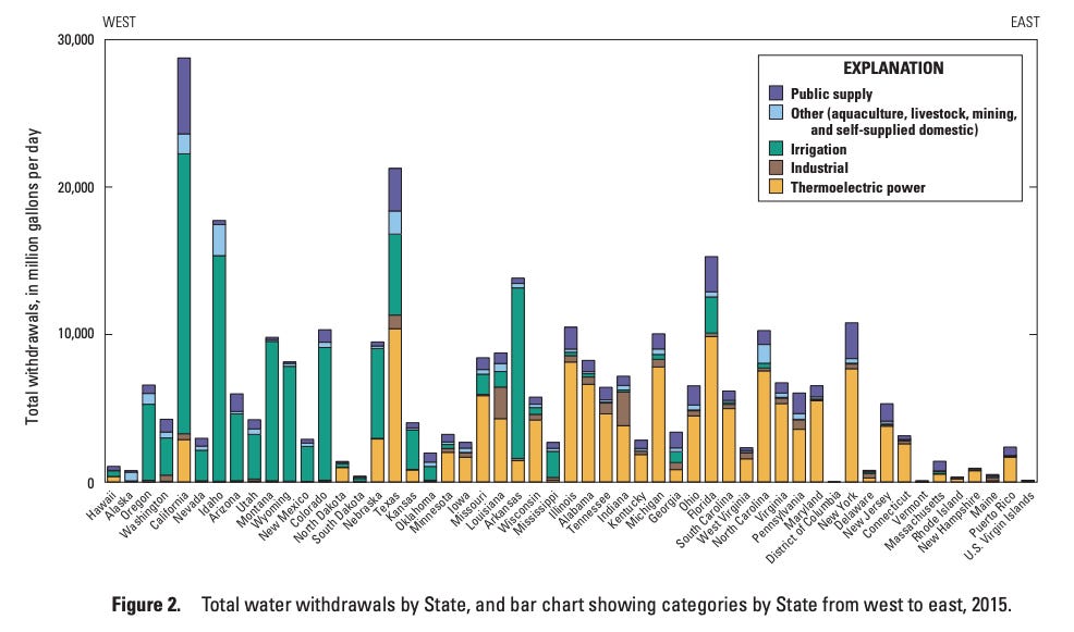 There’s something of a data inconsistency here. If you look only at states that give data for irrigated cropland specifically, it suggests that 95% or more of irrigation water is used for crops. However, overall irrigation water is on the order of 118 billion gallons of water a day, but sources like the USDA suggest that irrigated cropland is only around 70-75 billion gallons a day, leaving around 40% of irrigation water unaccounted for. It’s not clear to me whether irrigation water use is around 95% (and USDA is undercounting or USGS is overcounting), or if it's closer to 60% and there’s some other huge user of irrigation water.
