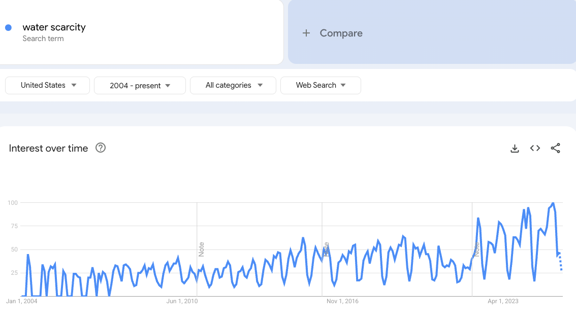 But this might be changing. Rising demand for water in the arid southwest (which has experienced decades of drought) is creating increasing concern about water availability. Vast amounts of investment is being poured into data center construction, and while data centers are most notable for consuming large amounts of power, they’re also heavy users of water: a large data center can use millions of gallons of water a day for cooling. Google search interest for “water scarcity” has gradually risen over the last two decades.