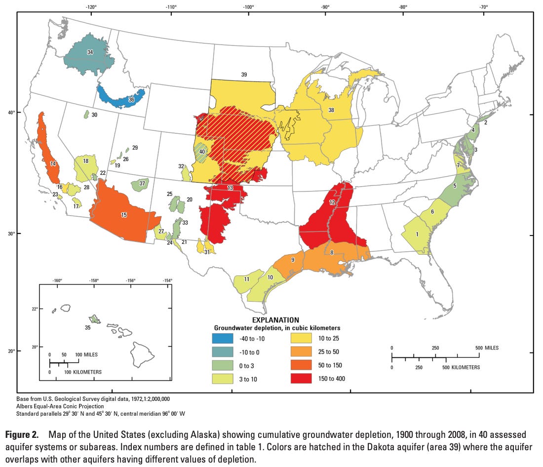 (Interestingly, this map shows groundwater recharging in an Idaho aquifer, despite Idaho being such a large user of irrigation water. Possibly this is explained by the time period difference, as this map only goes to 2008.)