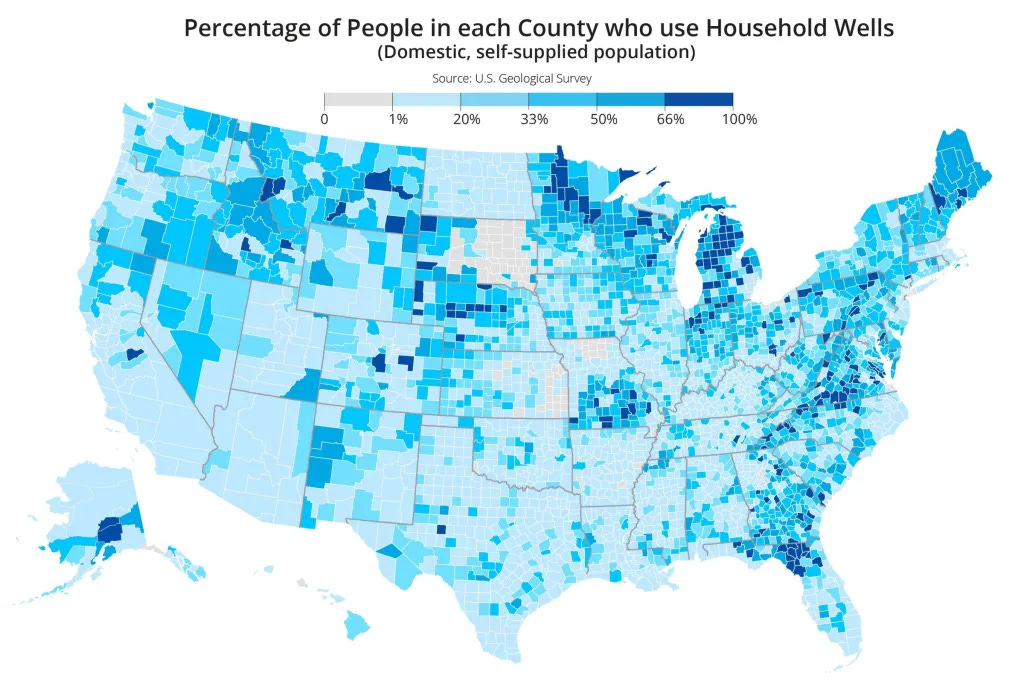 If we look at self-supplied water use specifically, we can see that it's highly regionally concentrated. In some areas of the country, self-supplied water makes up nearly all domestic water use, while in other areas of the country it's much less common.
