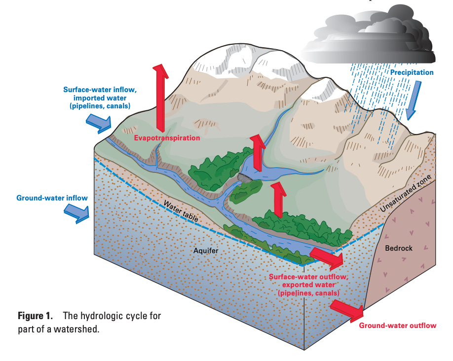 Most of us probably remember learning about the water cycle in school. Water falls to the earth via precipitation — rain, snow, sleet — and flows into rivers, lakes, streams, and water-bearing geological strata called aquifers. From there, water continues to move: it goes back into the atmosphere via evapotranspiration, moves from streams and rivers into aquifers (and vice versa), and flows out into the ocean.1