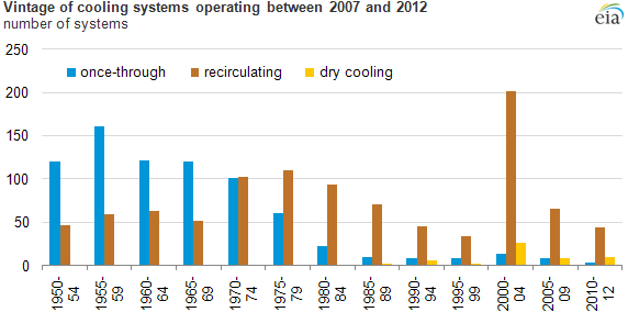 Since the 1970s, most thermoelectric power plants have been built with recirculating cooling systems rather than once-through cooling systems. This is due to things like the Clean Water Act, which set limits on thermal discharge from power plants and made once-through cooling systems less attractive. Recirculating systems circulate the same water over and over again through the system. These systems use much less water overall, but a much greater fraction of the water they do use is consumed (it's lost to evaporation, typically via large cooling towers). As of 2012 about 43% of thermal power plants used once-through cooling, but once-through cooling systems make up around 96% of all water used by thermoelectric power plants.