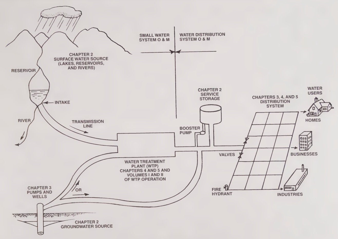 We use water by tapping these various stores and flows. At a high level, water infrastructure resembles electricity infrastructure. In both cases, you have large sources of supply (power plants for electricity and lakes/rivers/underground aquifers for water), which gets transported by a high-capacity transmission system. With electricity transmission is done by high-voltage power lines which connect power plants to substations; with water it's done by large-diameter pipes which connect sources to treatment plants or water storage facilities. From there, as with electricity, water is moved by a distribution system, smaller-capacity pipes and pumps that bring water to individual homes and businesses. And as with electricity, very large consumers of water (along with some smaller consumers) might tap various sources of water directly rather than get their supply via a utility company.