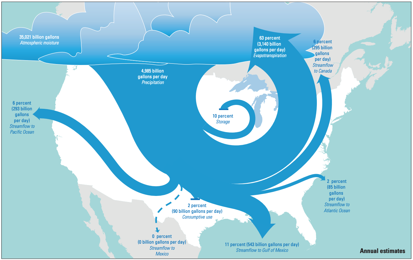 Altogether, the US receives about 5 trillion gallons of precipitation a day. Most of that (63%) gets returned to the atmosphere via evapotranspiration. Much of the rest ultimately flows into the Gulf of Mexico (11%), Pacific Ocean (6%), and Atlantic Ocean (2%). About 10% gets stored in surface bodies of water (lakes, reservoirs) or underground aquifers, and 6% flows back into Canada. The remaining 2% is consumed by people in various ways.