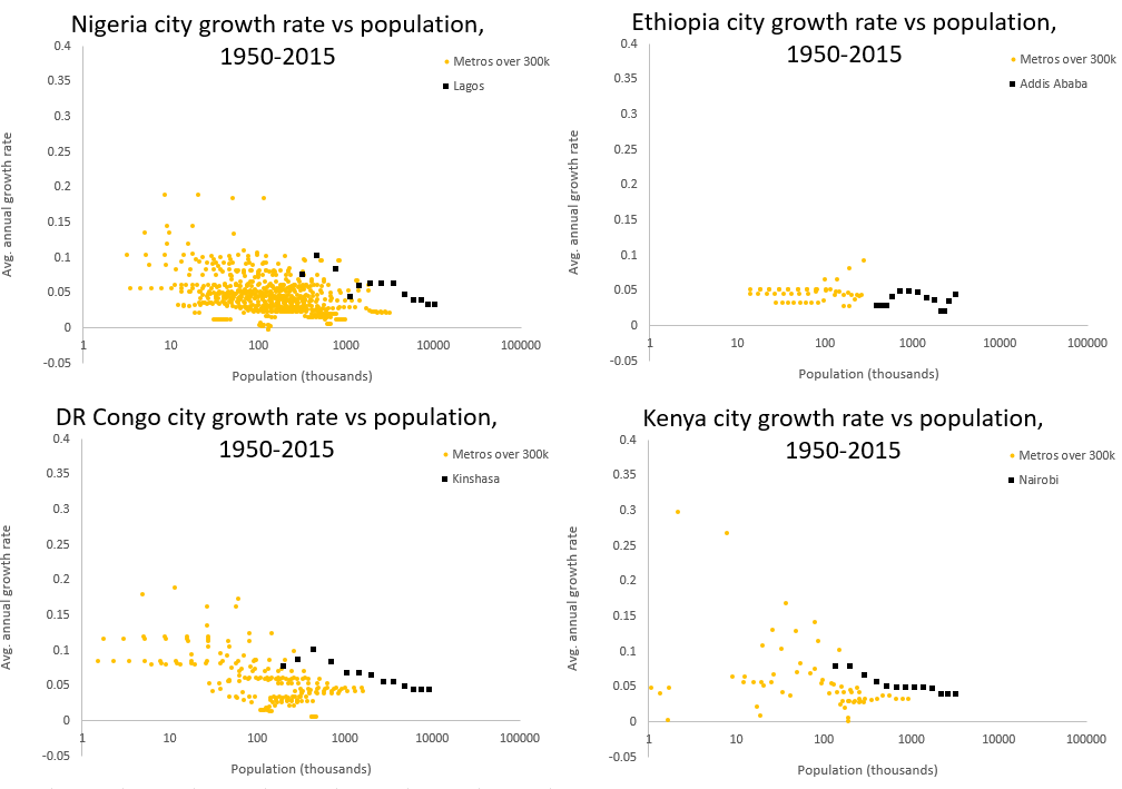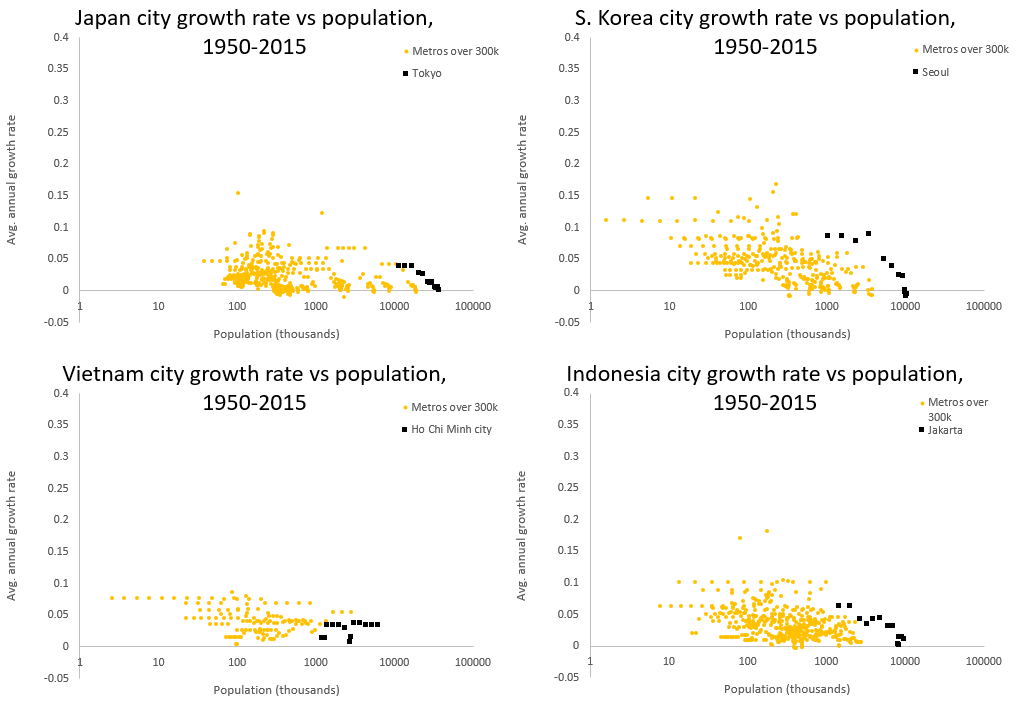 Outside of China, most countries seem to show a similar city growth pattern as the US. We see most cities growing somewhere between 0 and 5% a year, a handful of small cities growing rapidly (10-20% a year or more), a few larger cities maintaining growth rates above 10%, and growth rates below 10% for cities beyond 1 million.