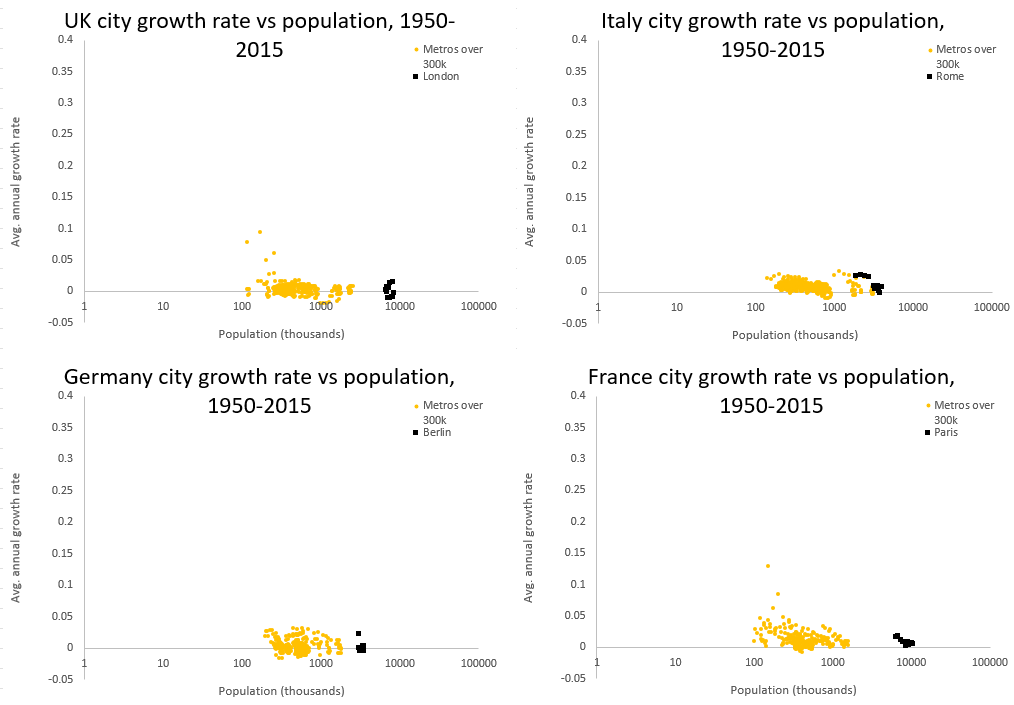 We see almost no European cities with high growth rates. Since 1950, no large German or Italian city has ever had more than a 5% growth rate, and it's only happened a handful of times for UK and French cities. No small city (less than 100,000 people) has grown into a large city in any of these countries since 1950, whereas in other parts of the world this is much more common.