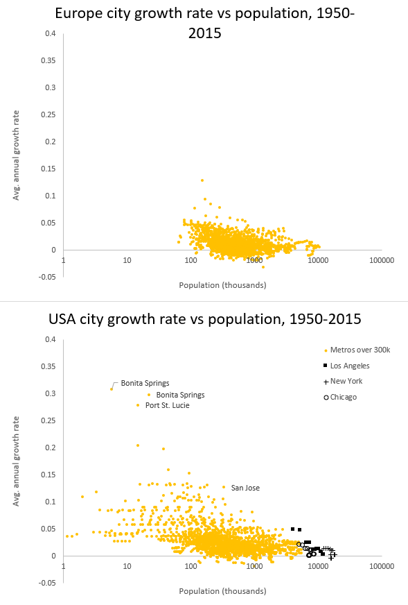 One way to deal with this is to look at city growth rates as a function of population. This lets us see how growth rate changes as a city gets larger, and lets us do an apples to apples comparison of different cities which may have grown at different times.