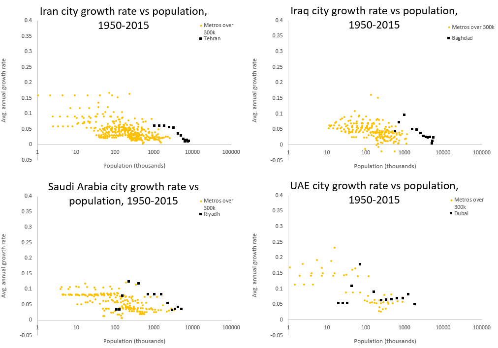 So, to sum up, while cities of different sizes grow at the same rate on average, and while most cities grow in the neighborhood of 0-5% per year, smaller cities have the potential to grow faster than larger cities. A city of less than 100,000 might be able to have growth rates of 10-20% or more, and cities of up to 3-400,000 can potentially have growth rates in the neighborhood of 10-15%. Potential growth rates tend to fall as cities grow larger, and cities above 1 million people almost all grow at less than 10% per year, and usually less than 5% per year. The US, the Middle East, Southeast Asia, Africa, and South America all seem to have followed this basic pattern, assuming the data is reliable.