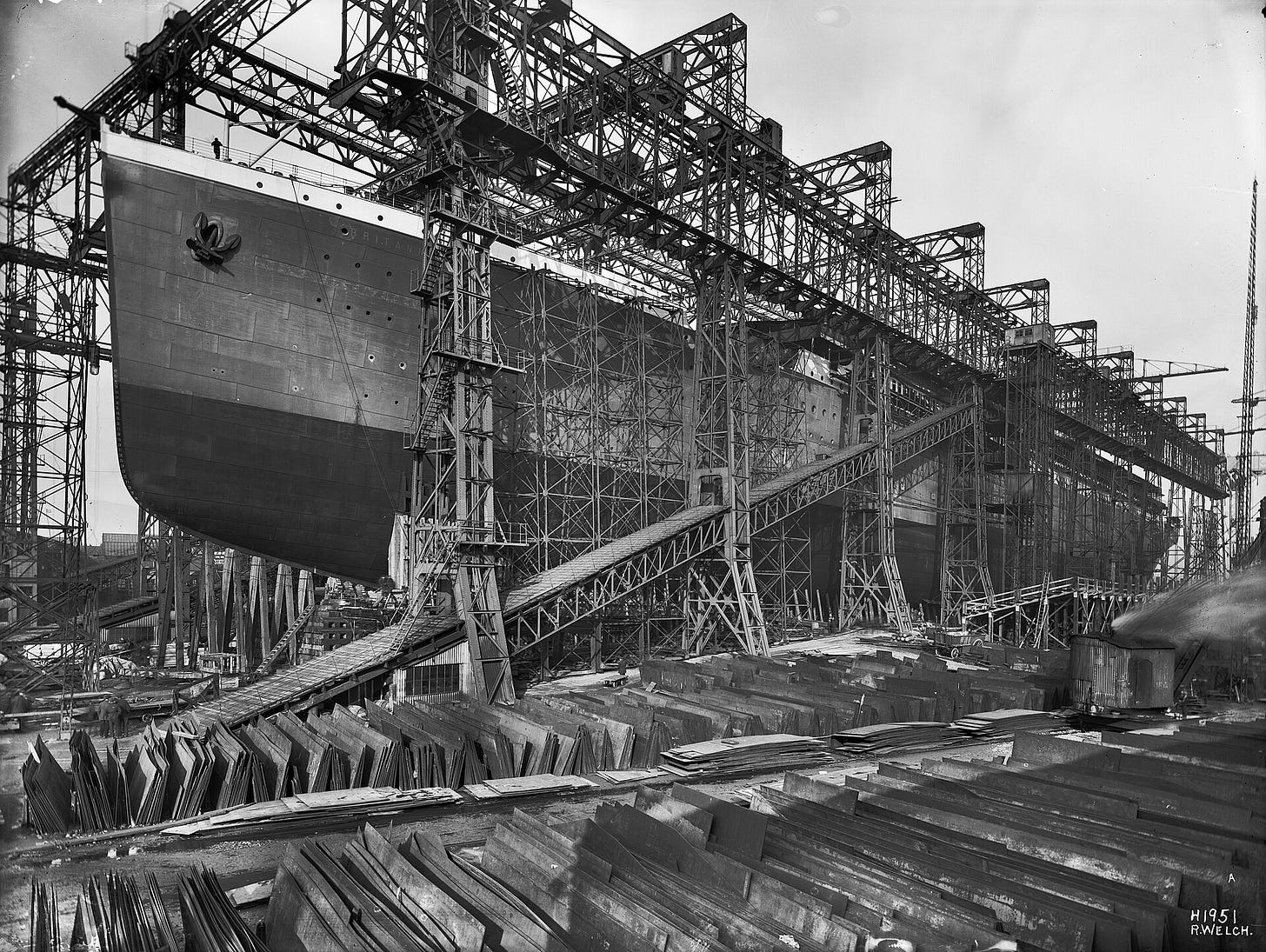 The structure of the UK’s shipbuilding industry reflected the conditions it operated under. Building iron and steel ships obviously required machinery and infrastructure — machine tools, cranes, slipways (sloped areas of ground the ship would slide down upon completion) — but wherever possible, British yards still eschewed expensive machinery or infrastructure in favor of skilled labor. British yards in the late 19th and early 20th century have been described as “under-equipped in relation to those of her competitors”: for instance, while the most advanced foreign yards had large, mechanically operated cranes that could be moved from berth to berth, most British yards “retained their fixed cranes, manually operated derricks, and push-carts on rails”. Because of the notoriously cyclical shipbuilding industry, which often had “seven fat years followed by seven lean years”, using labor-intensive production methods let shipbuilders easily scale up and down their operations depending on demand: workers could be hired when they were needed, and quickly fired when weren’t. A capital intensive production operation, by contrast, couldn’t easily reduce its overheads during a downturn: one extremely large, modern, and expensive British shipyard at Dalmuir was forced to close in 1929 due to difficulty servicing its overheads when demand for new ships fell.