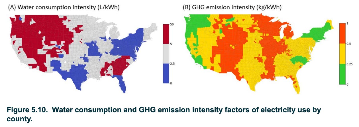 Even if we assume all data centers are powered by thermoelectric power plants, this implies a total indirect consumptive use for data centers of around 234 million gallons per day, substantially less than the 579 million gallons given by the LBL report. (The LBL report actually states “nearly 800 billion liters” in 2023, which works out to 579 million gallons daily use.)