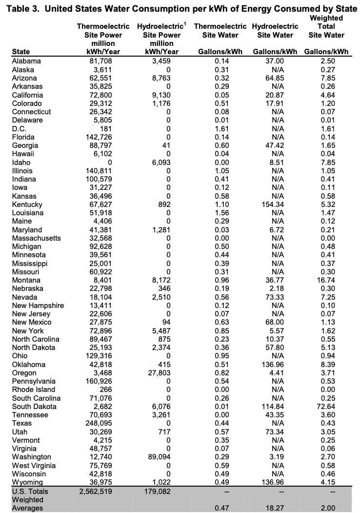 Per this 2003 report from the National Renewable Energy Laboratory, thermoelectric power plants consume about 0.47 gallons of water per kilowatt hour of electricity generated, a figure that aligns with USGS values for thermal power plant water consumption. Hydroelectric power plants, on the other hand, “consume” an astounding 18.27 gallons per kilowatt hour via evaporation, almost 40 times as much! This value is so high that it drives up the average level of electric power water consumption for the entire US.
