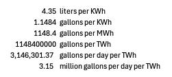 It doesn’t seem to be a typo: later in the report they note that indirect water consumption from data center power use is around 4.5 liters per kilowatt/hour (which works out to 579 MGal/day), slightly higher than overall US electric power water consumption overall at 4.35 liters per kilowatt hour. 4.35 liters per kilowatt hour works out to 3.15 million gallons per day per TWh, more than twice the USGS value for thermoelectric power plant consumption (which as a reminder is 1.2-1.4 million gallons per day).