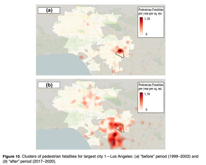 The previous article looked at the location of pedestrian deaths by state, and by type of road, but didn’t go more granular than that. I was pointed to a 2023 study that looked at changes in where pedestrian deaths are occuring. It notes that pedestrian deaths seem to have actually declined in downtowns, even as they’ve increased in suburban areas: