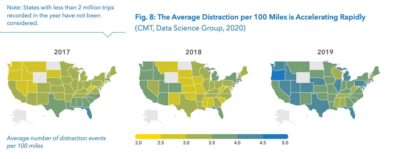 I looked up some reports from the firm that gathers this data (Cambridge Mobile Telematics), and it does seem to show an increase in driver phone use in the US over time. Its 2020 report “The Harsh Realities of Distracted Driving” shows that the number of “distraction events” (most of which are phone use) rose across the US from 2017 to 2020.