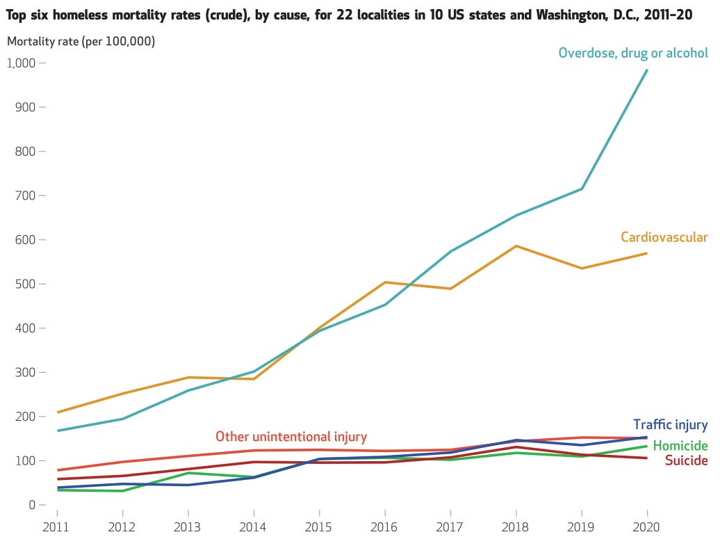 It’s also the case that the rate of death from traffic accidents among the homeless has dramatically risen in recent years. A study on the causes of death in the homeless across several different locations found that traffic fatalities had increased substantially from 2011 to 2020 (eyeballing the graph, it seems to have roughly quadrupled, from around 40 per 100,000 in 2011 to 150 per 100,000 in 2020).