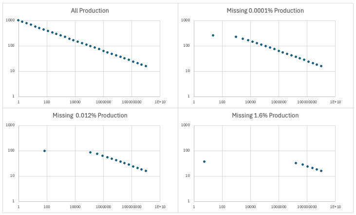 The graphs below show several learning curves. The first is the “true” learning curve with all the production data intact. The other graphs have various amounts of early production data missing, causing the graph to incorrectly start at an earlier point. The more production is omitted, the more the learning curve flattens out and deviates from the true curve. And it doesn’t take much omitted data to really distort the curves, so even the fact that most commodity use is fairly recent doesn’t rescue us from this problem.
