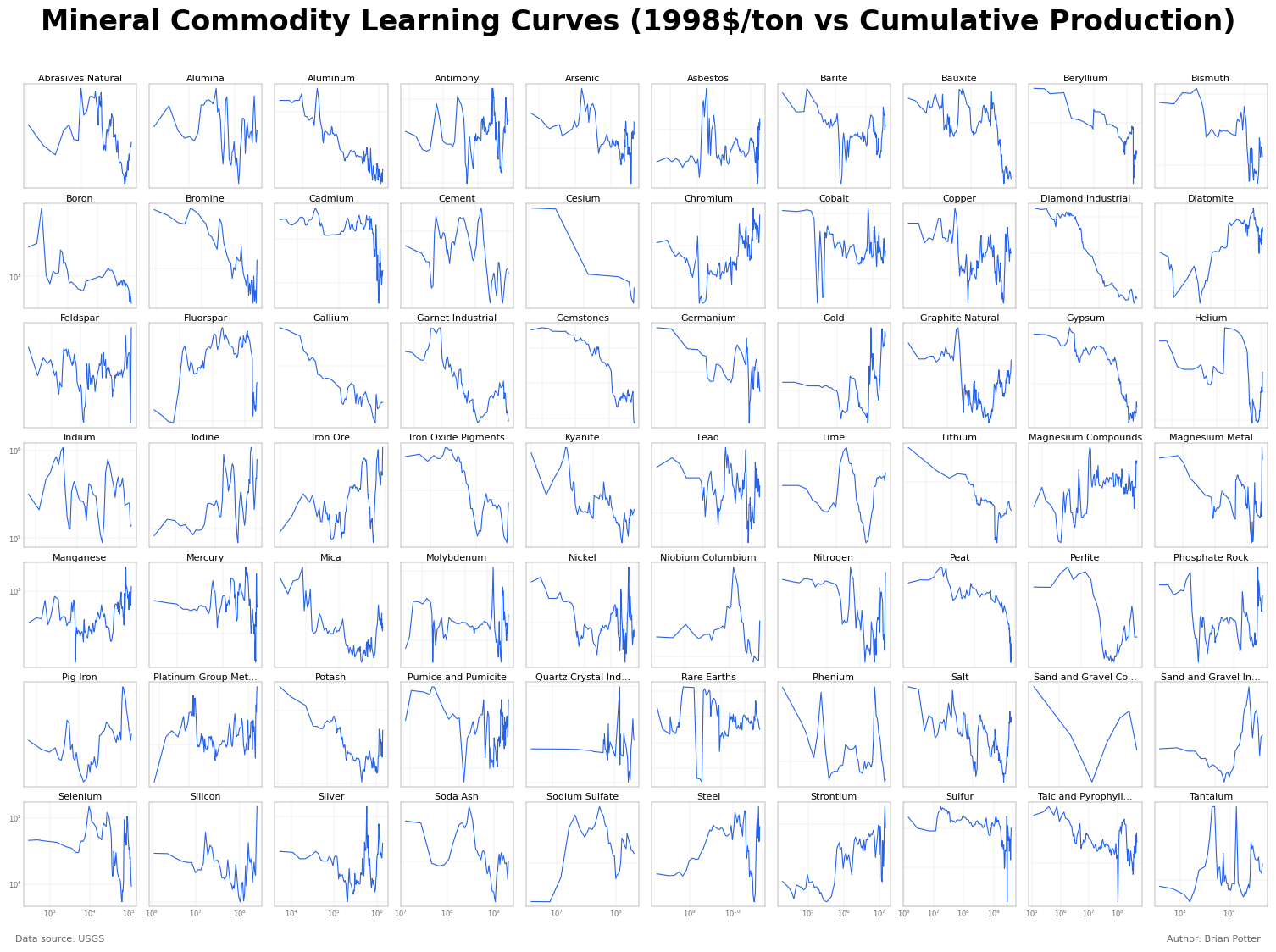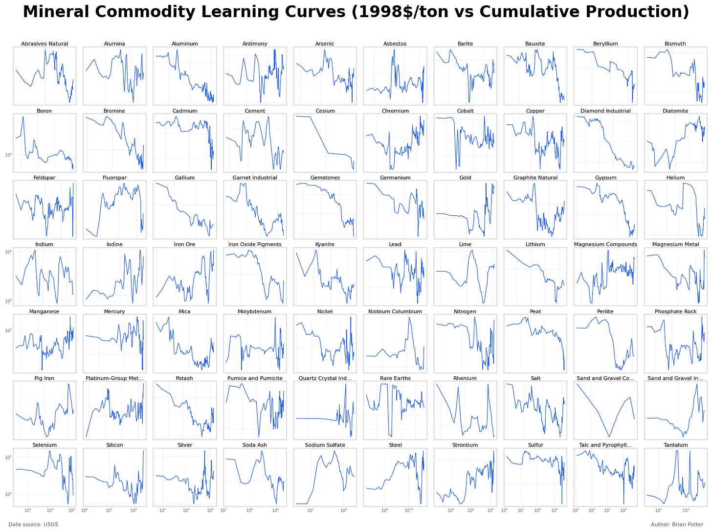 Determining if commodities have learning curves — that is, if they fall in price as a function of cumulative production volume — turns out to be a complicated question. If you just graph price vs. production volume data for various commodities, very few seem like they’re following any sort of learning curve, showing nice straight or mostly-straight lines going down and to the right on a log-log plot. The USGS mineral commodity datasets, include worldwide production volume for various mineral commodities going back to 1900. Some of these look like they’re following a learning curve, but most don’t.