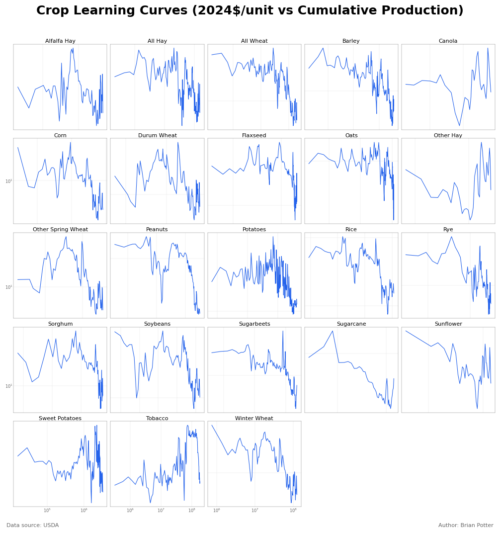 Similarly, USDA crop datasets include annual quantities harvested, which we can use to construct a learning curve. These look a little more like learning curves (they’re generally headed down and to the right), but they’re certainly not nice straight lines.