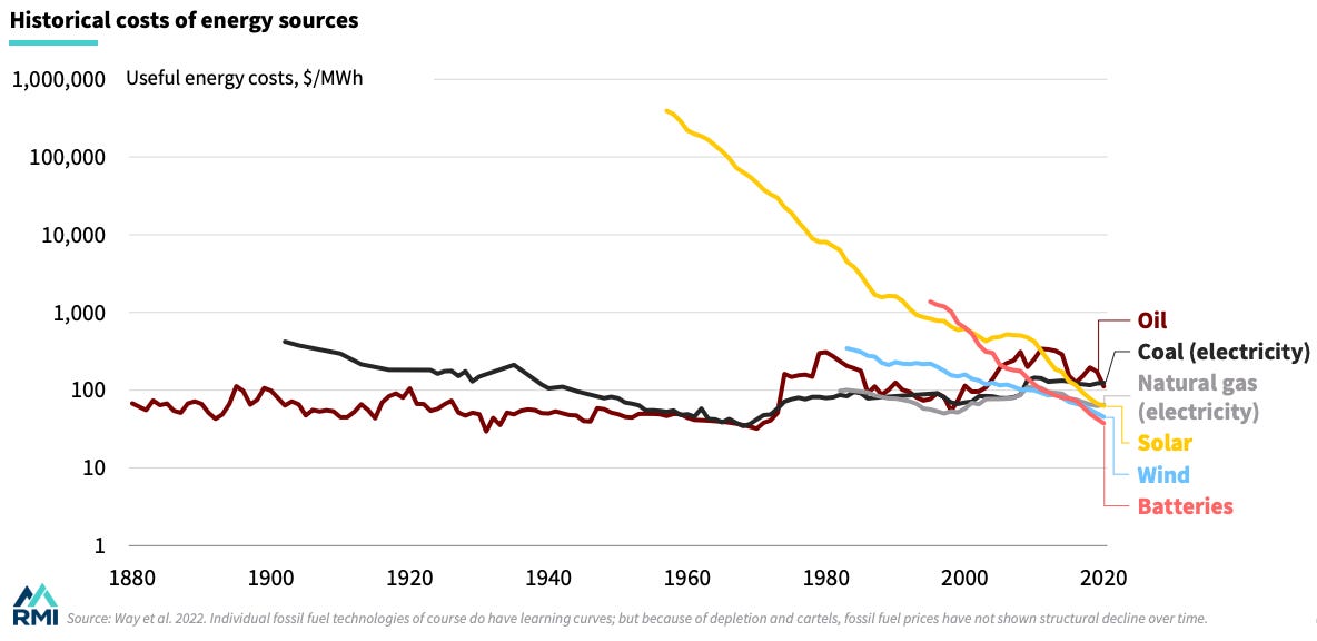 Individual fossil fuel technologies of course do have learning curves; but because of depletion and cartels, fossil fuel prices have not shown structural decline over time.