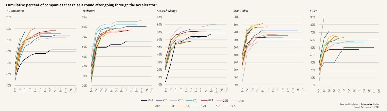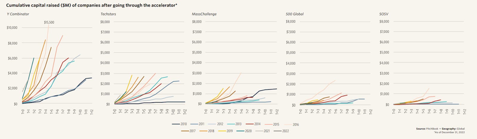 Pitchbook has an interesting report on the success of various startup accelerators (organizations which give funding and mentorship to very early stage startups.) Y Combinator unsurprisingly comes out on top in a lot of metrics, including “largest exits” and “cumulative capital raised”, though interestingly it seems to slightly underperform in “fraction of companies that later raised a round of funding.” (Click to embiggen.)
