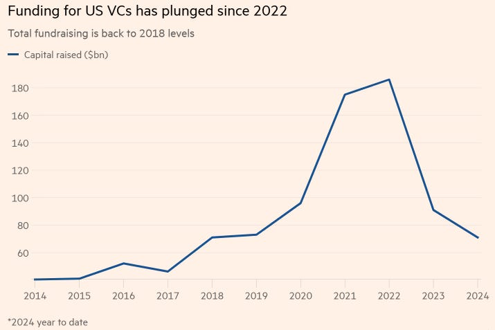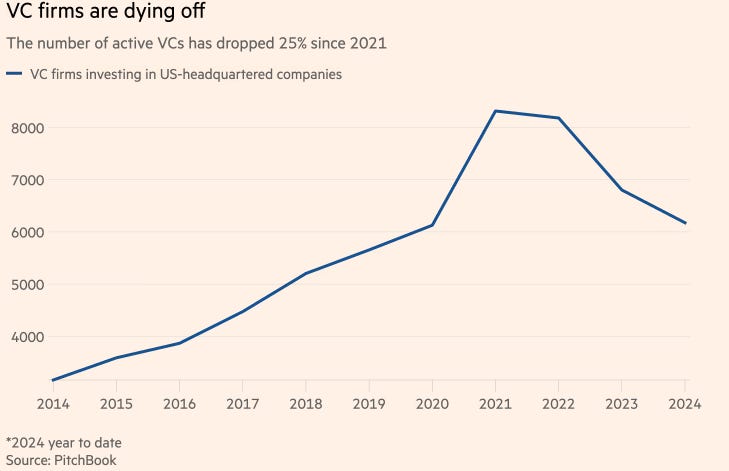 Related, The Financial Times has an article about the struggles of the venture capital industry: funding is down and becoming concentrated in the largest firms, and many younger, smaller firms are closing their doors:
