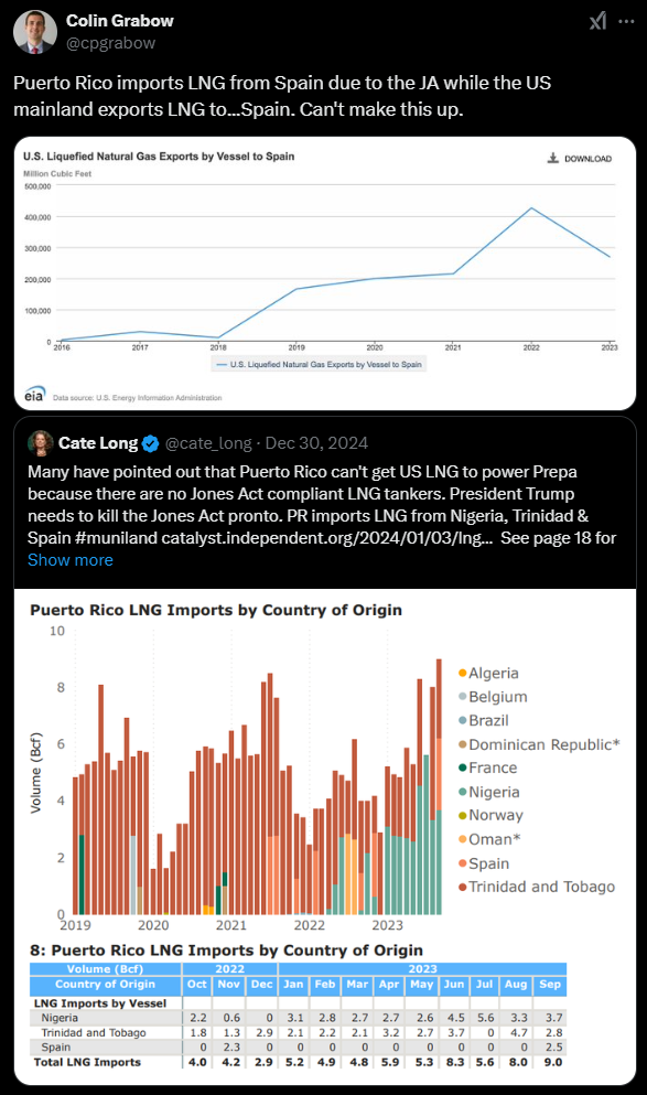 The Jones Act is the law that requires, among other things, ships that carry cargo between US ports to be US-built. Because there are no US-built liquified natural gas (LNG) carriers, we’re in the absurd situation where LNG is being shipped from the continental US to Spain, and then from Spain to Puerto Rico. Via Colin Grabow on Twitter: