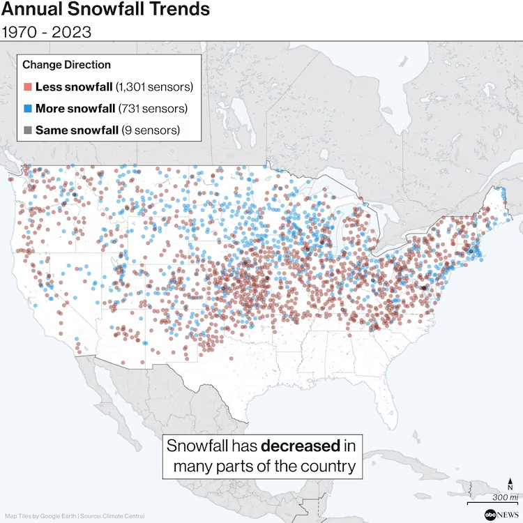 Related, this map from ABC News shows how snowfall has changed across the country over the past 50 years. On balance, it’s decreased:
