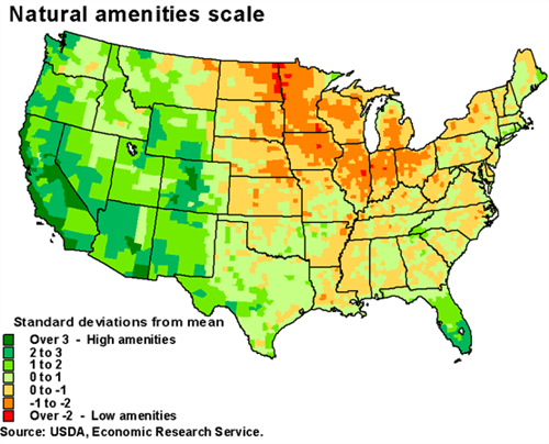 This USDA website has a county-by-county map and dataset of the country’s “natural amenities” - the best and worst places to live based on a ranking that combines temperature in the winter and summer, sunshine, humidity, water access, and terrain variation. The west coast, south west, and Florida all rank highly, whereas the midwest scores very poorly, though it’s based on temperature data collected between 1941 and 1970 and has possibly changed since then.