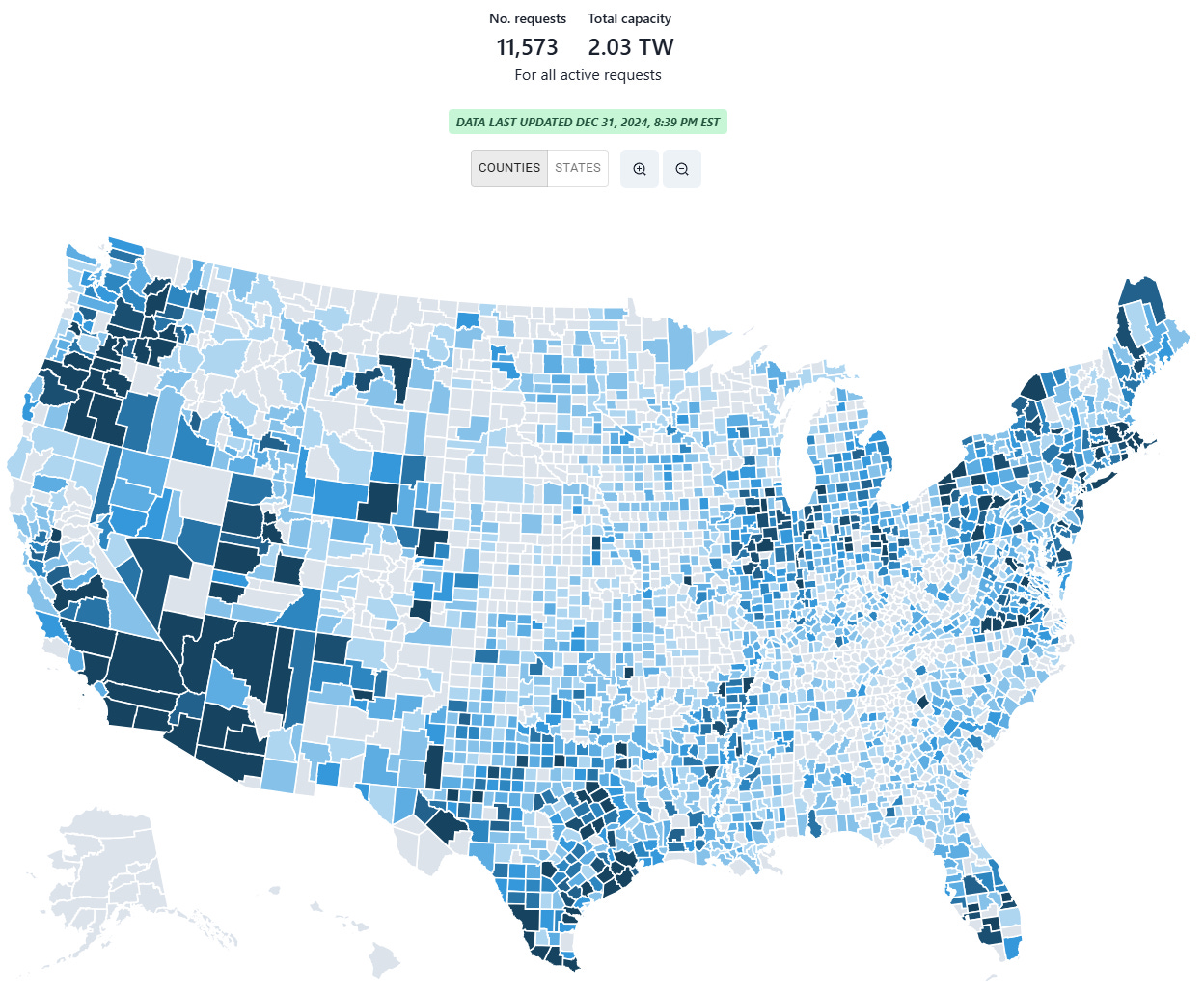 Interconnection.fyi has some very cool charts of interconnection queue data (the list of projects waiting to connect to the electrical grid), including a county-by-county map of interconnection requests. It’s not quite what I expected: for one, I expected to see more in Georgia given the huge amount of data centers being built there. Not sure what to make of this.