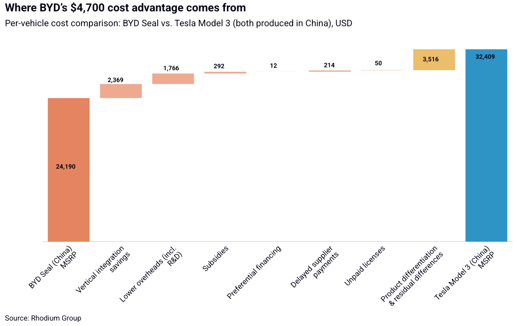 The Rhodium Group has a good article breaking down why Chinese EVs are so cheap. It doesn’t seem to be about labor productivity (which is lower than Western firms), or subsidies. Instead, the advantage mostly comes from the level of vertical integration they’re operating at. “For BYD, vertical integration is the single most important factor behind the company’s price advantage. That said, even among Chinese OEMs, BYD and Leapmotor are outliers. This helps explain why BYD has been among the companies most consistently leading price decreases over 2024 and 2025. Vertical integration requires higher upfront capex and R&D, but it eliminates supplier markups across a much larger share of the vehicle.” [RHG]