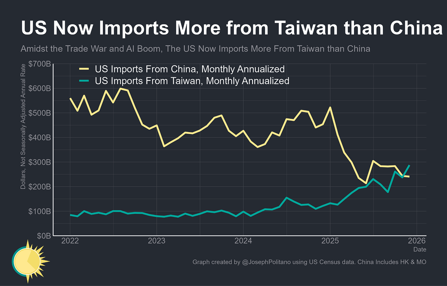Thanks to the trade war with China, and the huge amount of chips and other electronics the US is importing from Taiwan for data center construction, the US now imports more from Taiwan than it does from China. [X]