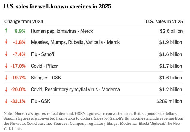 US vaccine manufacturers are struggling: thanks to RFK’s anti-vaccine efforts at the Department of Health and Human Services, vaccine sales are down, jobs are getting cut, and investments in new vaccines are being scaled back. And it seems like things might get even worse for them. “A major concern for the big companies is whether the Trump administration will do away with the special liability protections afforded to vaccine makers that have helped them stay in the market.” [NYT]