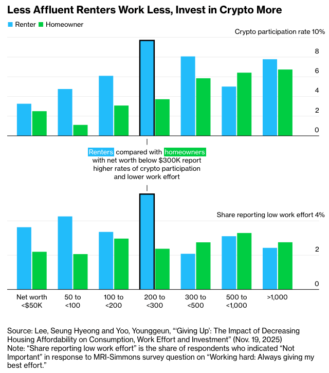 Bloomberg has a piece looking at different decisions made by homeowners, renters who expect to buy a home someday, and renters who expect never to own a home. One interesting datapoint: for low-income brackets, renters have a higher propensity to invest in crypto, and a higher rate of reporting that they put in low effort at work. [Bloomberg]