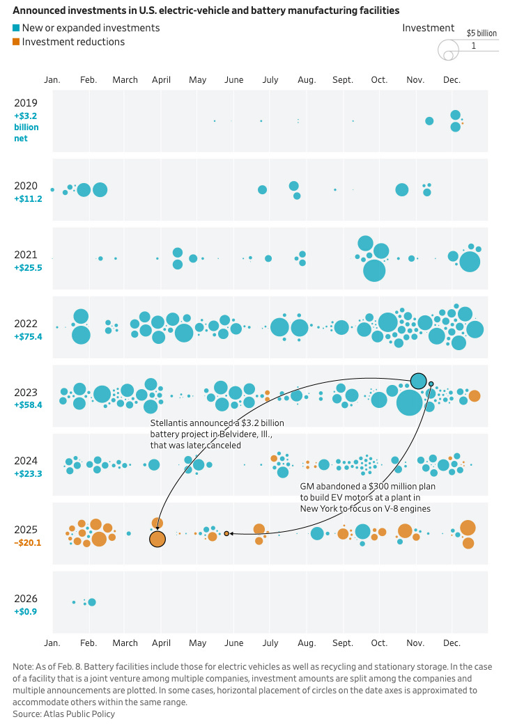 The WSJ on the EV writedowns of the US auto manufacturers. “More than $20 billion in previously announced investments in EV and battery facilities were wiped out last year, according to Atlas Public Policy, which tracks clean-economy investments. That drove the first net annual decrease in announced investments in years.” [Wall Street Journal] Related, car manufacturer Stellantis sells its stake in a Canadian battery manufacturing plant for $100. [Detroit News]
