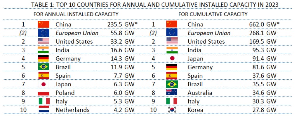 22 gigawatts is up from 2.8 gigawatts in 2022, and 5 gigawatts in 2023. 22 gigawatts is more capacity than all but a handful of large countries install annually.