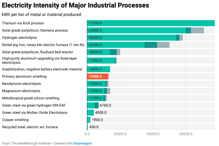 Tulsa, Oklahoma is building the first aluminum smelter built in the US in 50 years, which would double(!) US smelting capacity. [WSJ] Related, this Breakthrough Institute Piece on aluminum and China’s manufacturing prowess has an interesting graphic showing which materials require the most electricity to produce. Titanium requires way more electricity, and electric arc steel requires way less electricity, than I realized. [Breakthrough]
