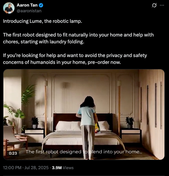 I’ve spent a bit of time discussing humanoid robots, and considering whether a humanoid form factor will win out, or if other robot form factors might make more sense. In that vein, here’s a company developing a robotic floor lamp, Lume, that will (supposedly) autonomously fold clothes for you when it's released in 2026: