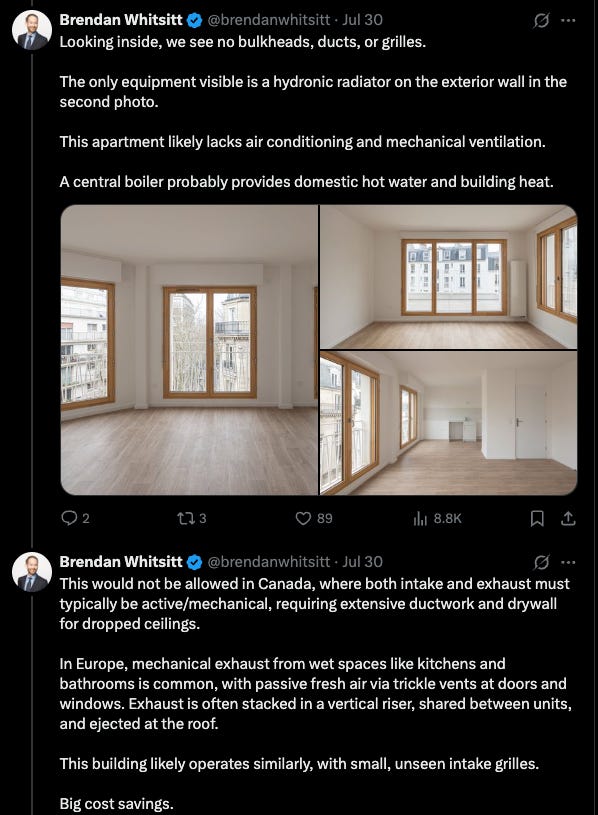 With transit construction, some of this comes down to improved efficiency and lower labor costs, but some of it comes down to differences in what gets built: US transit apparently often has much larger, more expensive stations than European transit. It seems like something similar might be true for multifamily construction as well. On Twitter, developer Brendan Whitsitt looks at a recent multifamily project in Paris, and lays out the many differences which allow it to be built for less than a similar project in Canada (which I believe will be fairly similar to US requirements.)