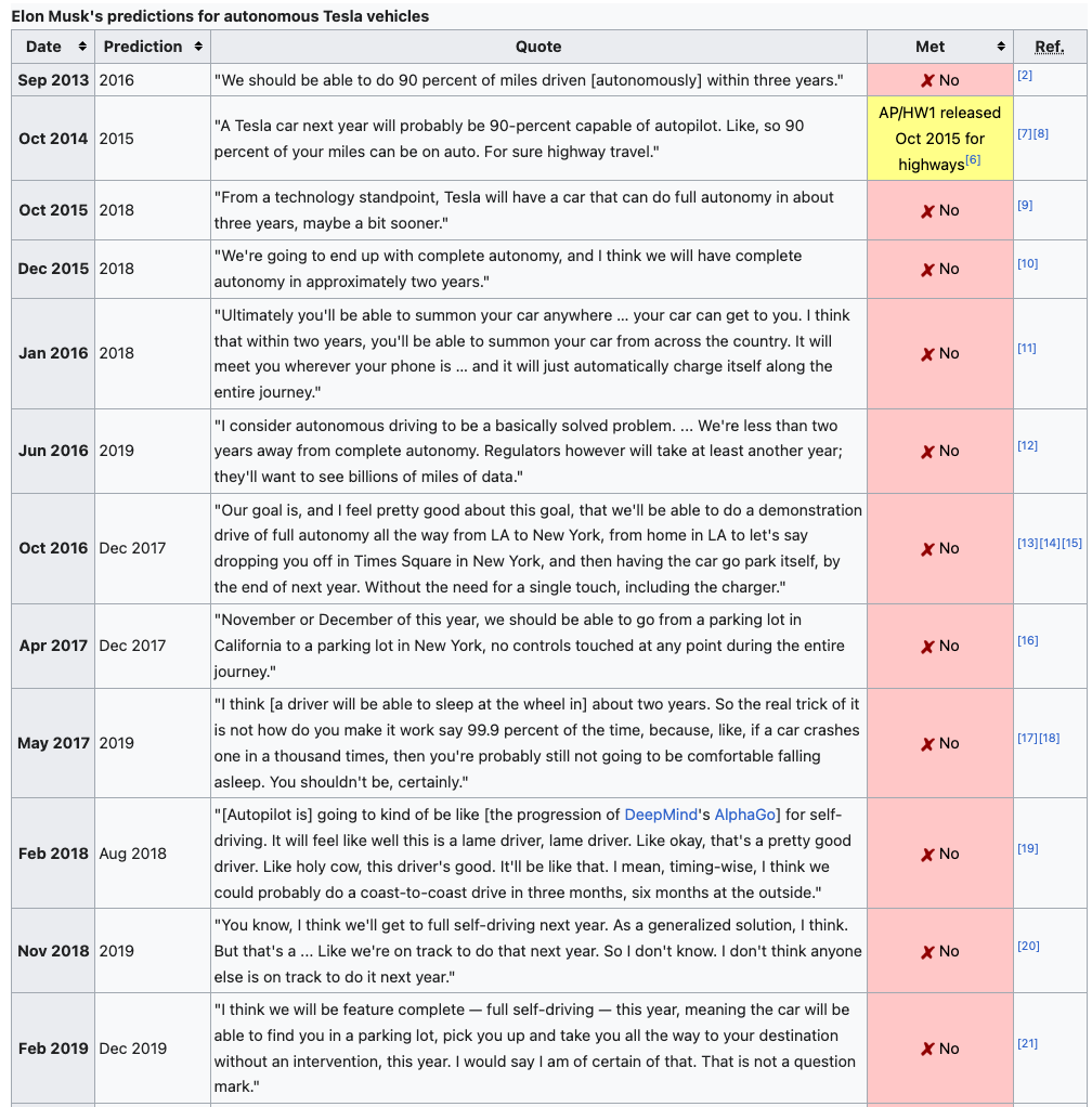 Tesla has been working on self-driving cars since at least 2013, and has been shipping Autopilot hardware since at least 2014. Over the years, Elon Musk has frequently made predictions about when various self-driving capabilities will be available, which have reliably proved to be overly optimistic. Wikipedia has a helpful list of every prediction Elon Musk has made around self-driving cars, and the status of that prediction.