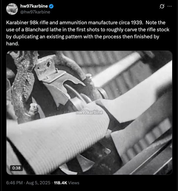 Most discussions of the lathe only mention its invention, but apparently such lathes remained in use well into the 20th century. On Twitter, hw97karbine posts a video of a Blanchard lathe being used to manufacture the stock for a German Karabiner 98k around 1939.
