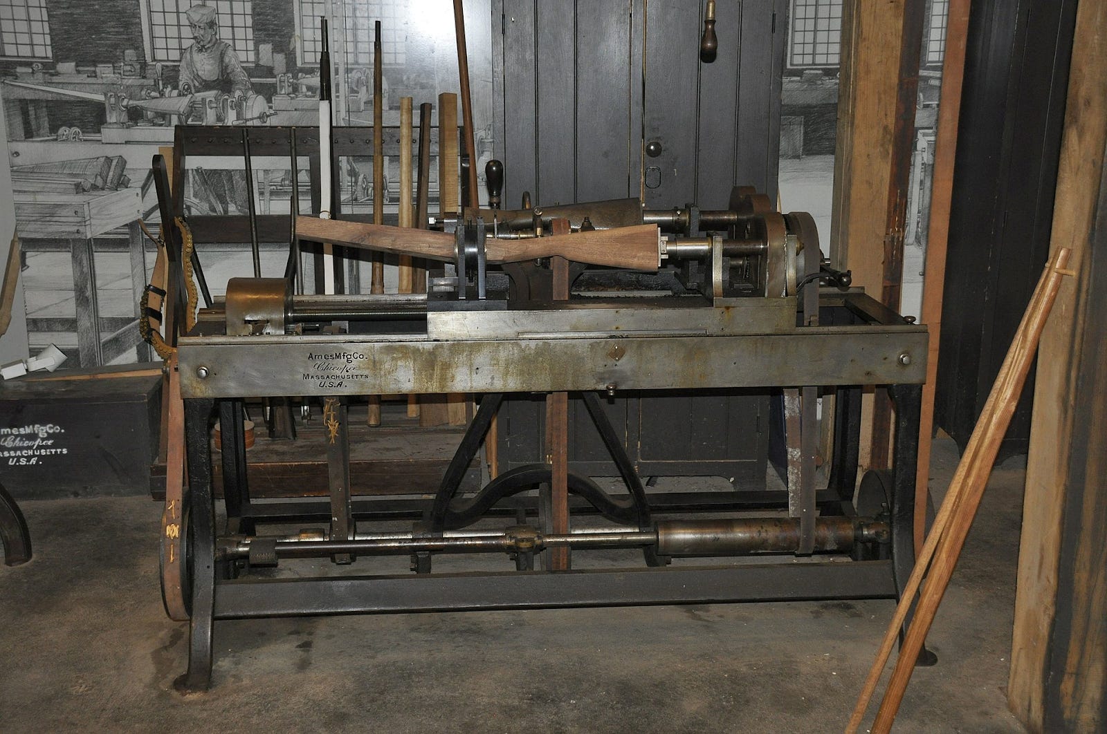 If you read much on the history of American invention, you’ll quickly come across mention of the Blanchard lathe, a clever invention made in the early 19th century for manufacturing gunstocks. The lathe used an existing gunstock as a cam mechanism: as the existing gunstock rotates, it pushes against a movable arm connected to a saw. The path of the saw movement matches the shape of the existing gunstock, and can cut a piece of wood into the same shape.