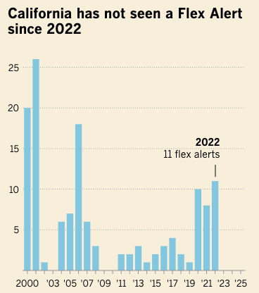 For decades, rolling blackouts and urgent calls for energy conservation were part of life in California — a reluctant summer ritual almost as reliable as the heat waves that drove them. But the state has undergone a quiet shift in recent years, and the California Independent System Operator hasn’t issued a single one of those emergency pleas, known as Flex Alerts, since 2022.